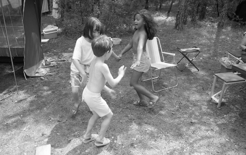 Arrivent le 16 juillet dans la grosse Mercedes les filles et Naomi. Le temps est à la pluie. La tente de Christine, celle des filles et celle de Naomi qu’elles montent seules. Dîner sous l' auvent. de temps en temps nous les verrons. Elles viennent déjeuner, goûter, rendre des petits services. Marie court et marche bien. Naomi a plus de difficultés à cause de ses hanches soit à cause de son poids. Elle part faire un jour la balade, mais revient avec une grosse ampoule sur l’orteil. Elle préfère jouer avec les petits. Ses chaussures du 39 étaient sans doute trop courtes, elle les abandonnera à Celony. Je lui achète une paire de sandales, comme le sol est détrempé à cause de la pluie, ça servira pour tout.